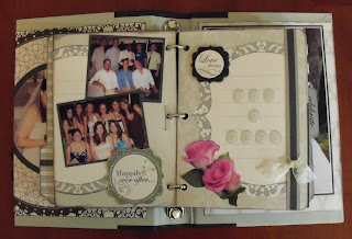 I've been having a wonderful time piecing together all of the black, grey and white papers and embellishments with this Heidi Swapp 9x6-ish memory binder (with 3-ring binding). Angela Moen designed this kit for The Button Farm and it was my pleasure to work with these items. I think that most of the products were from the Making Memories Wedding collection. There were glitter die-cuts, dimensional stickers, rub-ons, foil, netting and printed flowers. As if that wasn't enough, some other items were Queen & Co pearls, ribbon slides, various ribbons and lace. I added a couple of charms and beaded links from my own stash.