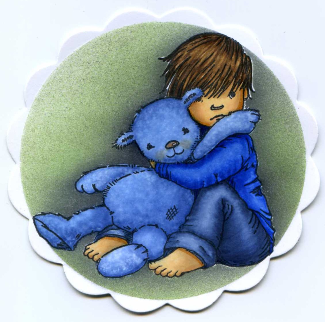 I was drawn to this 2010 Kathy Hare Sugar Nellie image named Worried. I found something touching about this little guy with his bear and this image seemed perfect for filling with "blues."